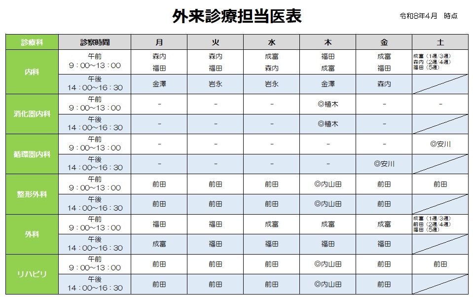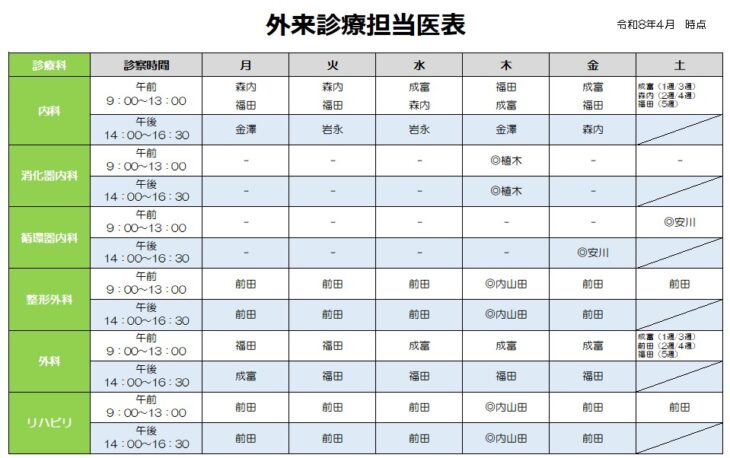 令和8年4月1日(水)より、一部診療科において外来担当医の変更および診療体制の改編を実施いたします。 受診される際には、事前に担当医表をご確認いただけますようお願い申し上げます。